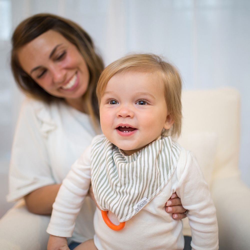 Dr. Brown's ha elaborado esta excelente bandana con mordedor de silicona para tu bebé. Esta bandana súper absorbente se convertirá en tu mejor aliado en el día a día de tu peque.